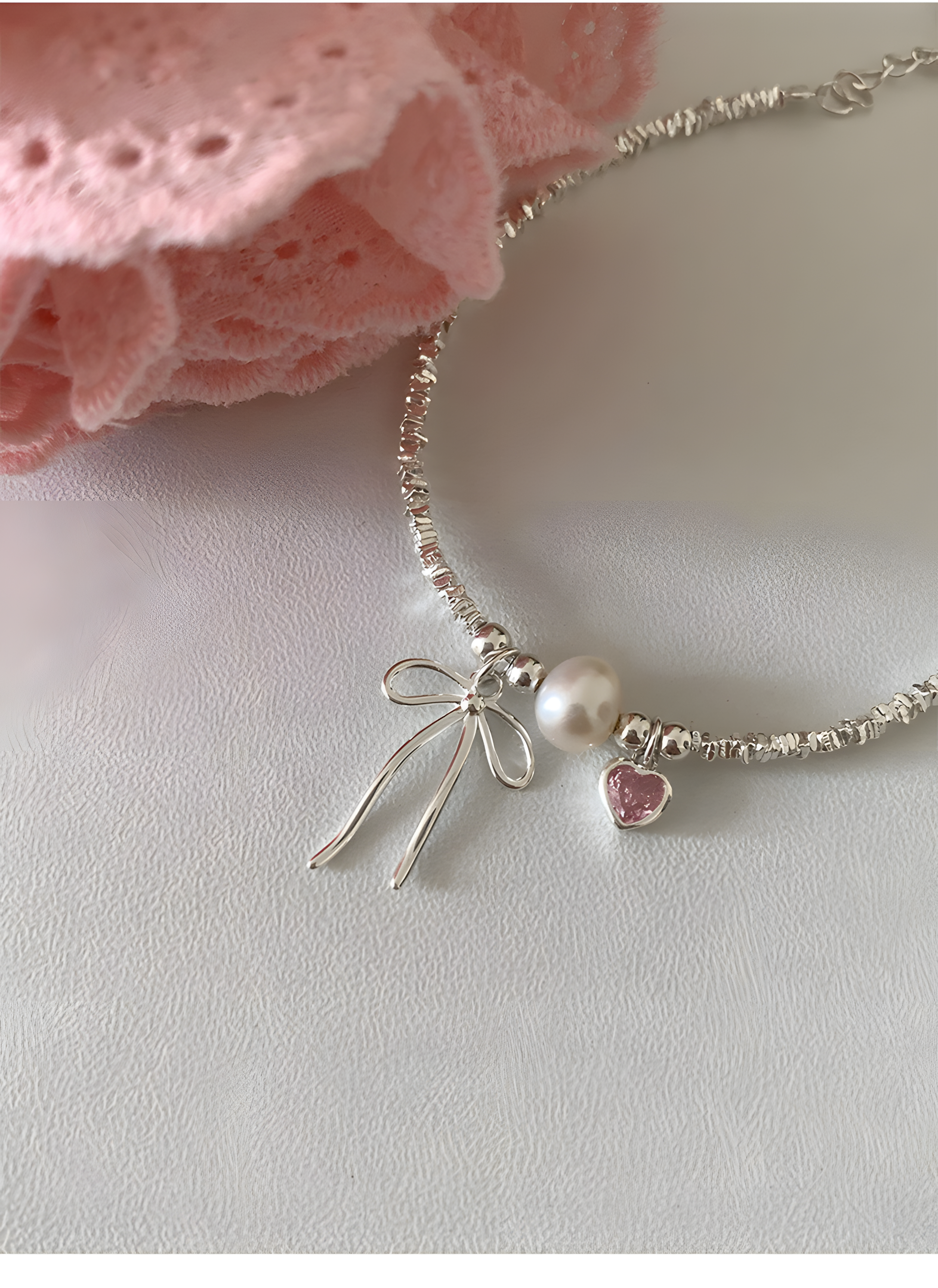 Elevate your everyday style with our Bow Charm Silver Bracelet, a delicate blend of sparkle and sweetness. Adorned with a dainty ribbon charm, lustrous faux pearl, and a pink heart stone, this bracelet is perfect for adding a graceful, feminine touch to any look. Whether you're heading out for a brunch, a date, or just treating yourself, this piece will always make you feel special.