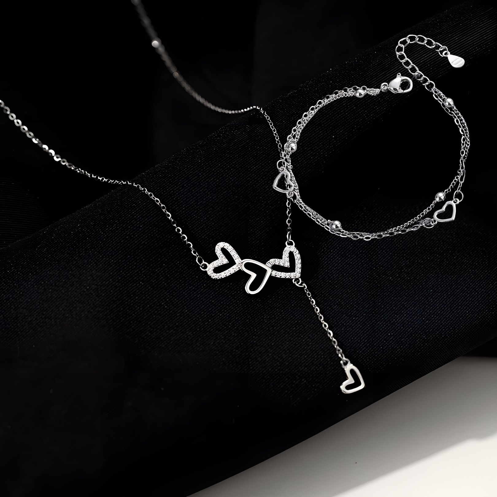 Delicate, meaningful, and effortlessly elegant — the Forever Hearts Set is designed for everyday moments that deserve a little love. Featuring minimal heart motifs in a sleek silver-tone finish, this necklace and bracelet duo adds a soft, romantic charm without feeling overdone. Perfect for daily wear, gifting, or layering with your favourites.