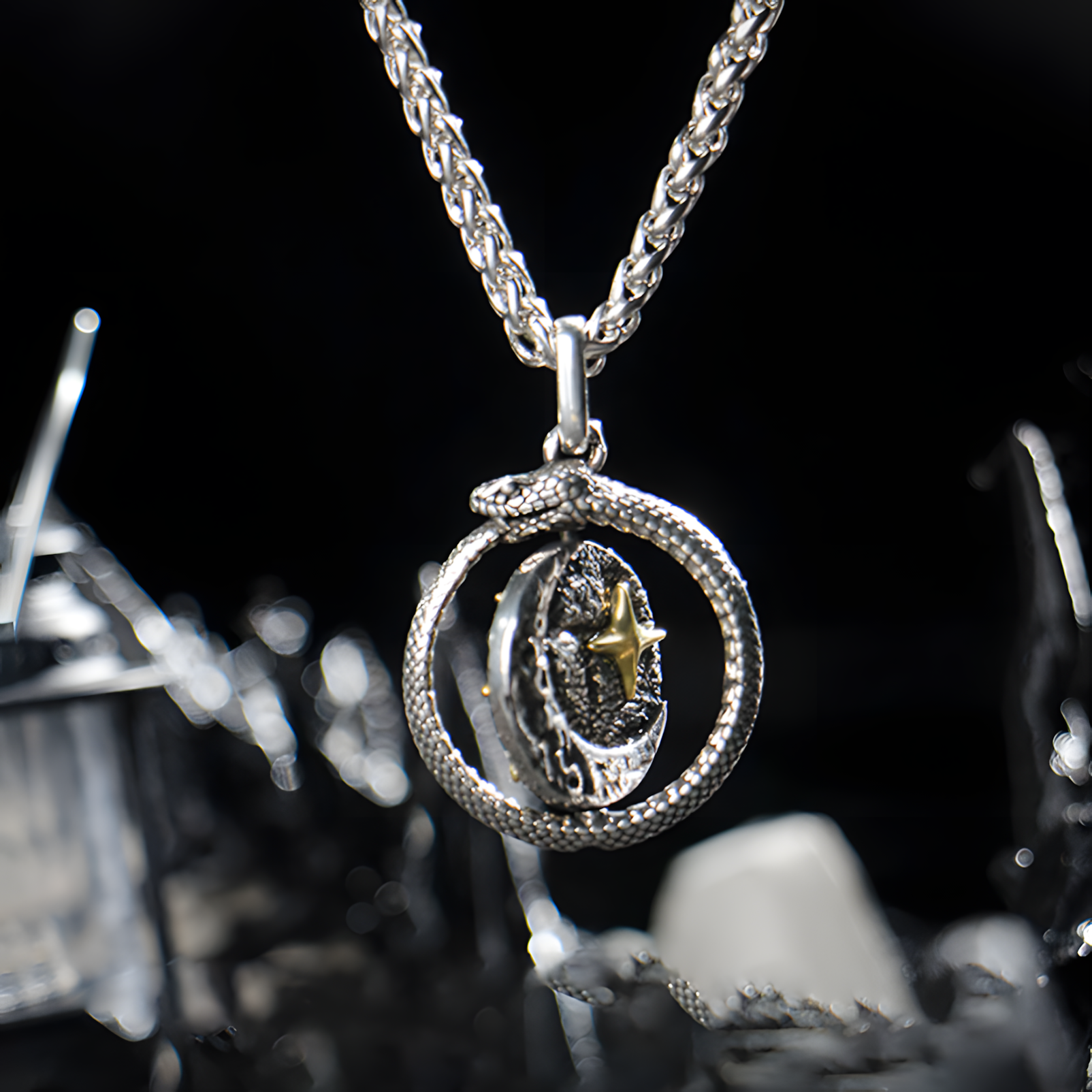 A striking pendant necklace symbolizing the eternal cycle of life — featuring a serpent circling the sun and moon. Handcrafted with two-tone metal detailing for timeless edge and bold energy.