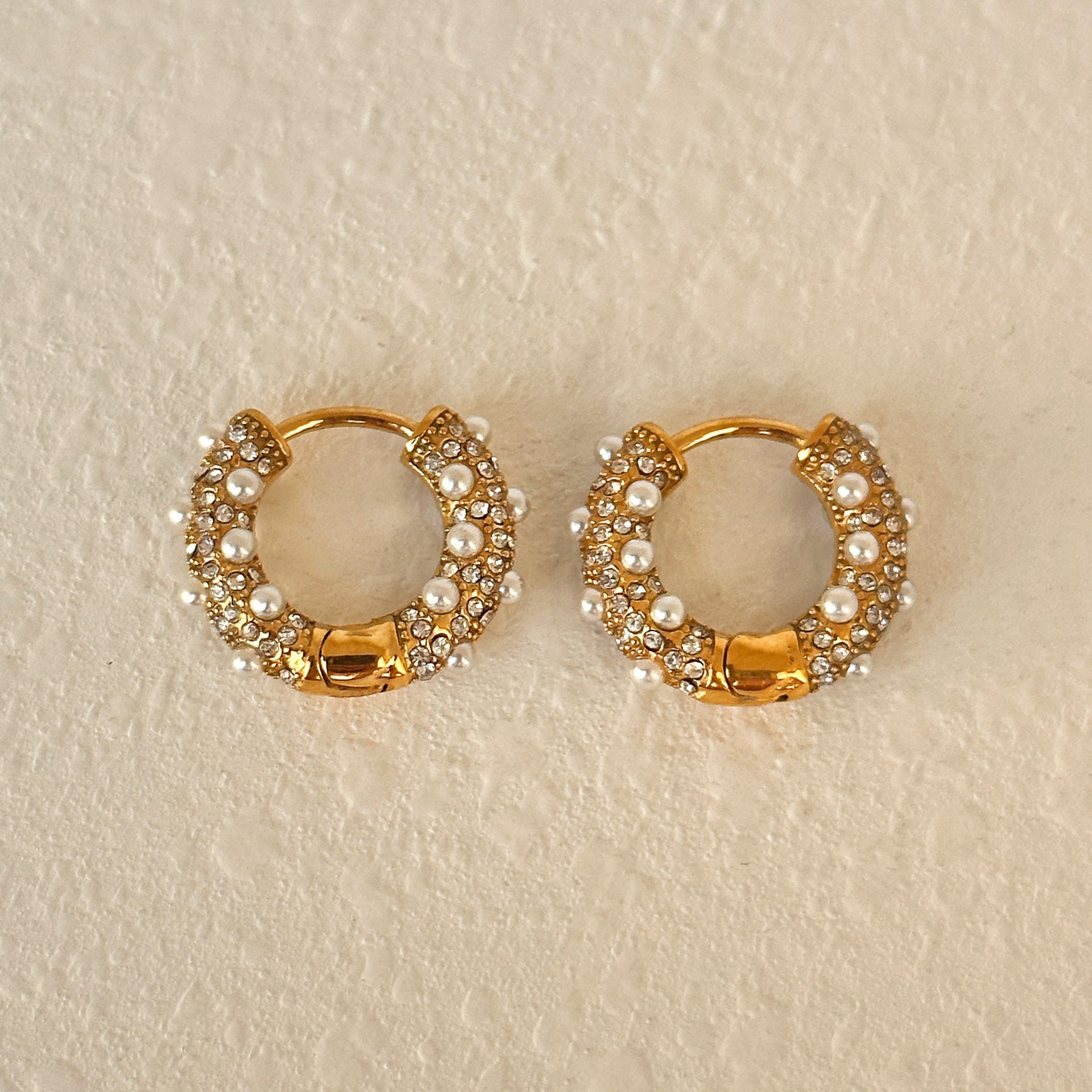 Gold-tone hoop earrings embellished with lustrous pearls and shimmering crystals — a perfect blend of modern and timeless jewelry style.