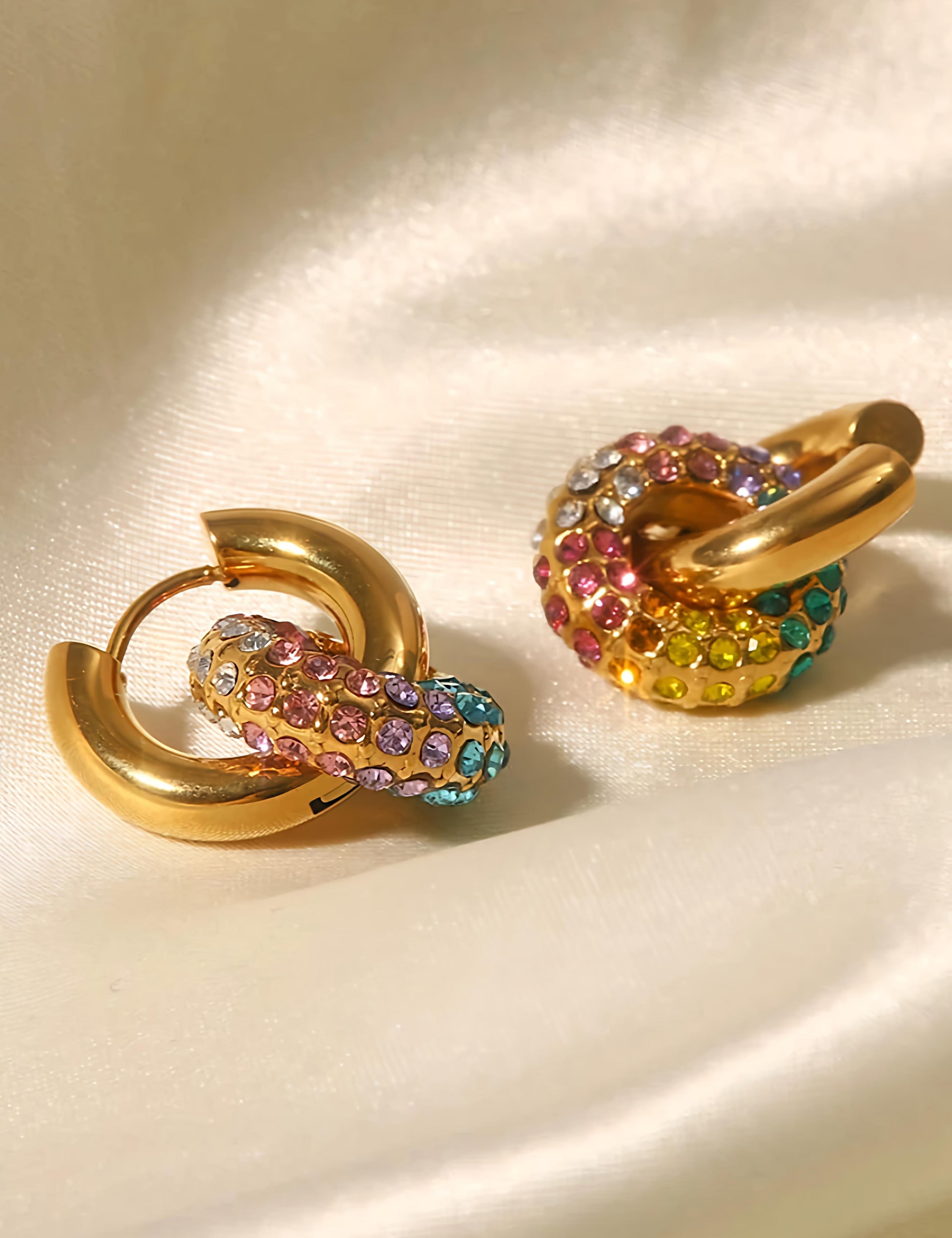A pair of dazzling multicolor hoop earrings encrusted with shimmering crystals. Designed to add glamour and sophistication, these hoops are the perfect blend of bold style and timeless elegance.