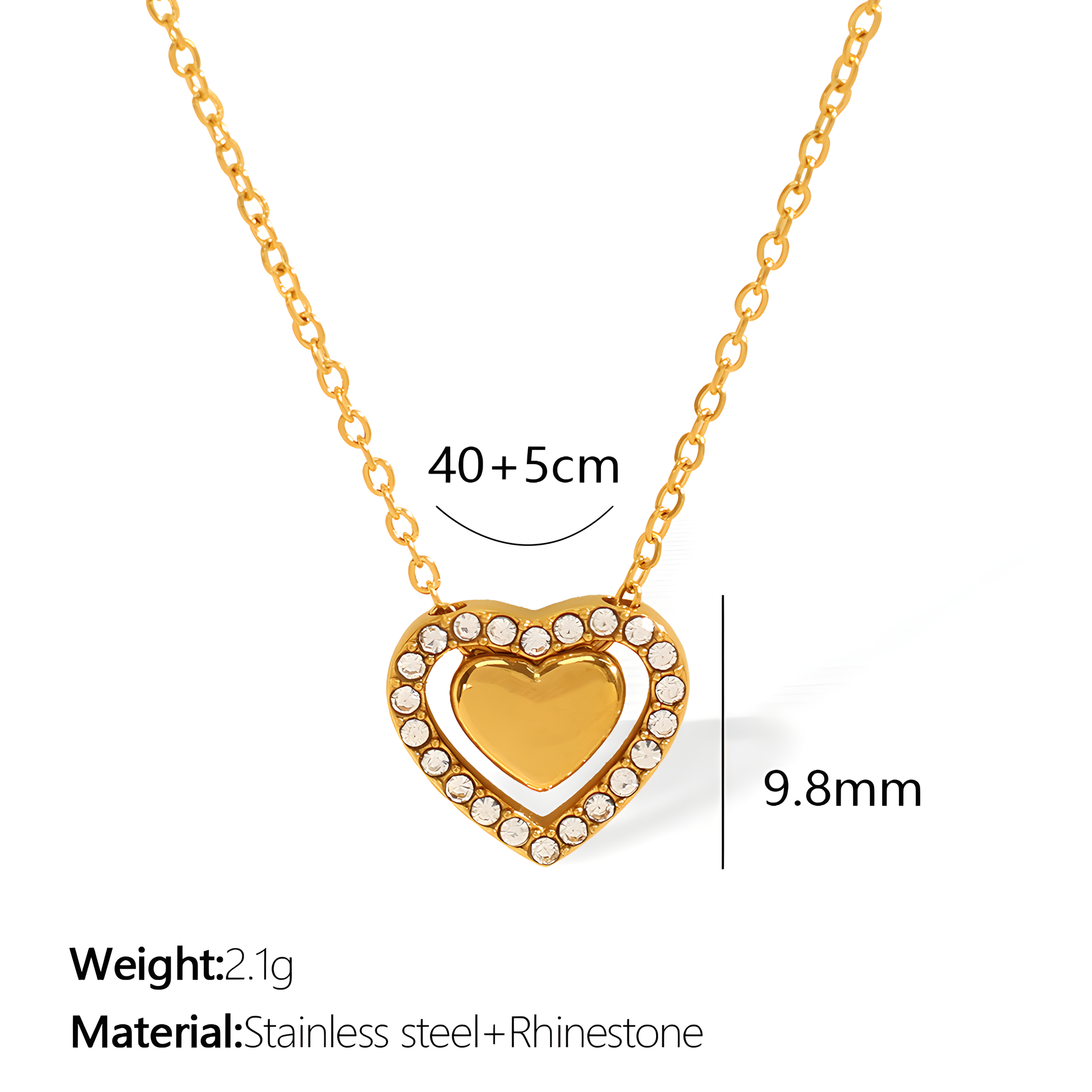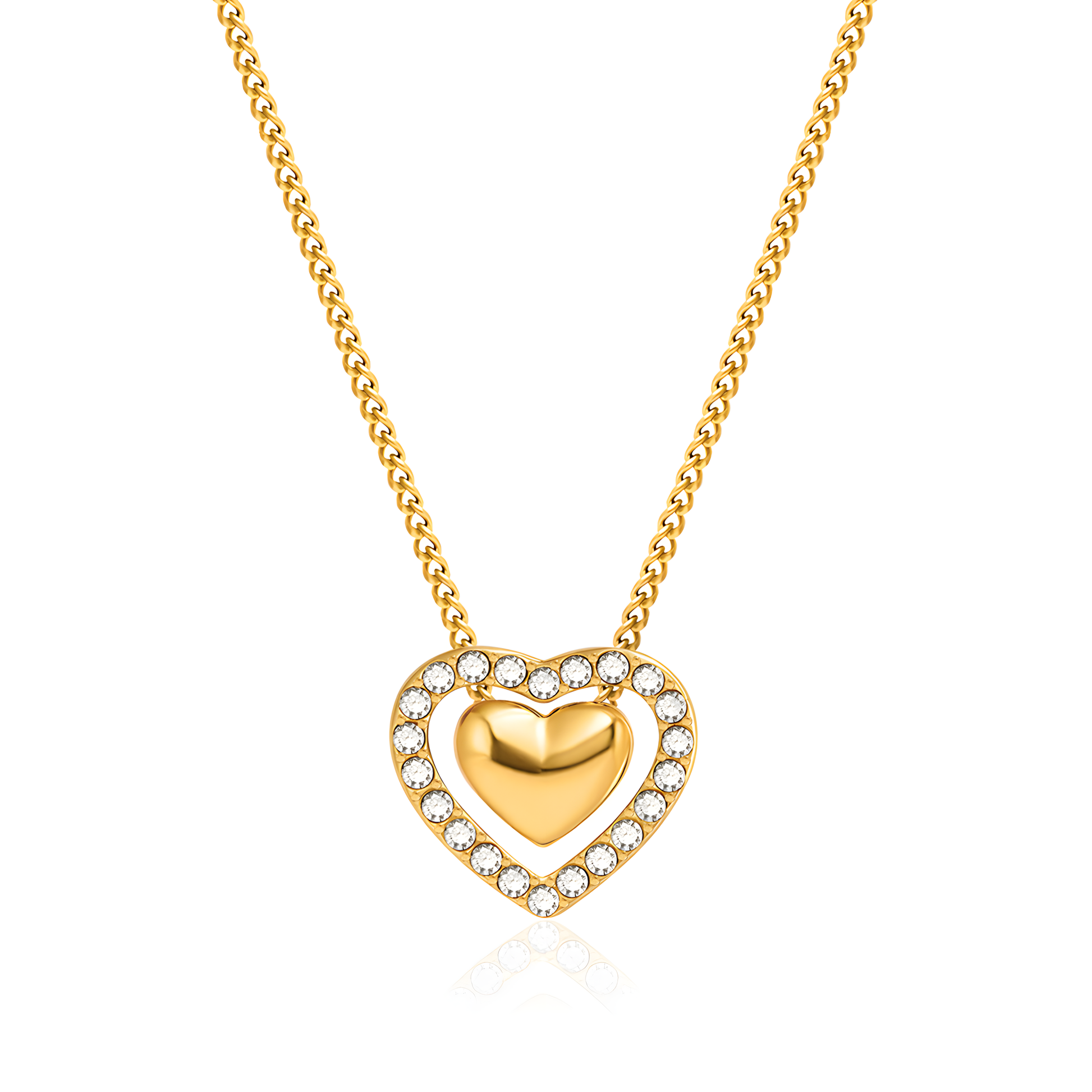 Design: Double-heart effect: inner solid gold heart embraced by crystal-studded outline.