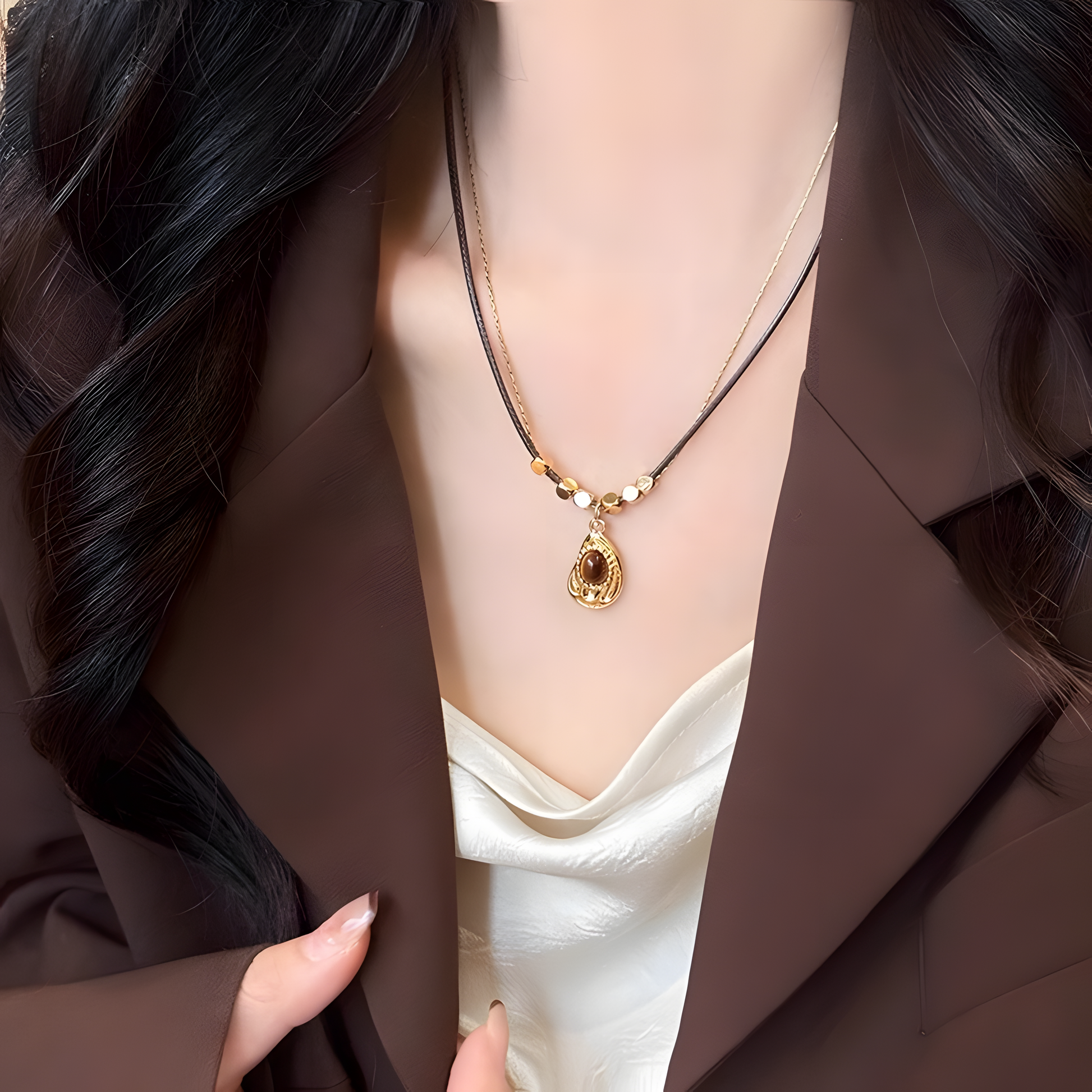 Design: Dual-layer necklace with a blend of cord and chain, accented with golden beads and an oval pendant.