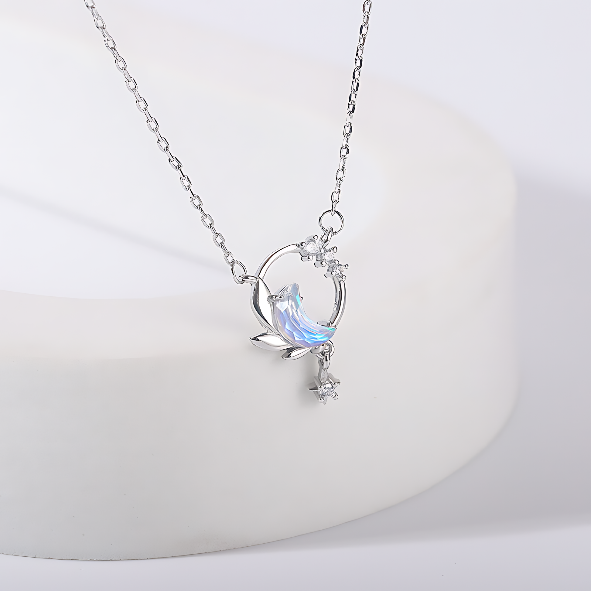 Design: Crescent moon pendant with blue opal center and tiny crystal stars symbolizing cosmic beauty.